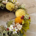 冬枯れの雑木林。枯れ葉やドライになった木の実が落ちている日だまりの大地から芽吹き花を咲かせたタンポポの明るさと楽しさを想い描きながら製作したリースです。タンポポに見立てたソーラーピンポンマム(黄色)やみかん色の小菊(プリザーブドフラワー)の明るさの中に、秋冬の名残りであるドライになった木の実がいろいろ隠されています。
