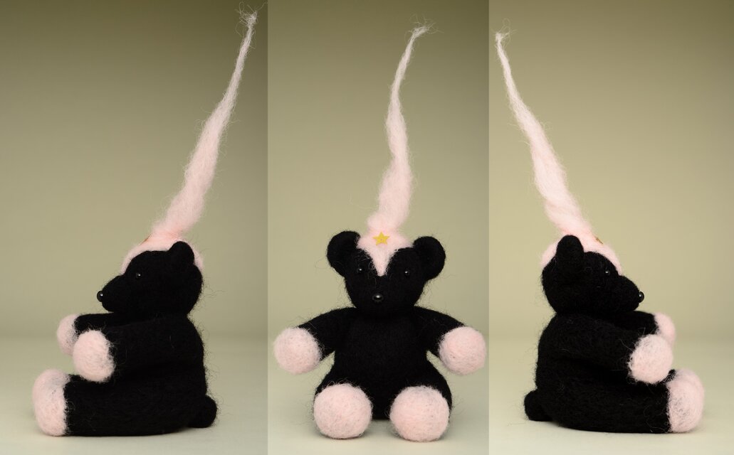 天まで届けと伸びていくピンクのふわふわヘアーにはゴールドの星も輝き、観る者を幸せに導いてくれそうです。繊細なニードルの表現をお楽しみください。