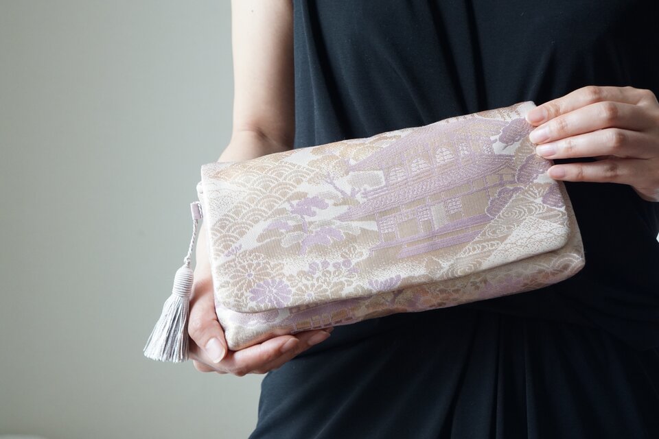 京都の仁和寺があしらわれ、ゴールドと藤色(紫の色)のコンビネーションが華やかで、高貴な品を醸し出すバックです。