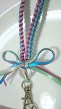 サテンリボンで作ったストラップです。取り外し可能なのでお手持ちの物にもお付けする事ができます。