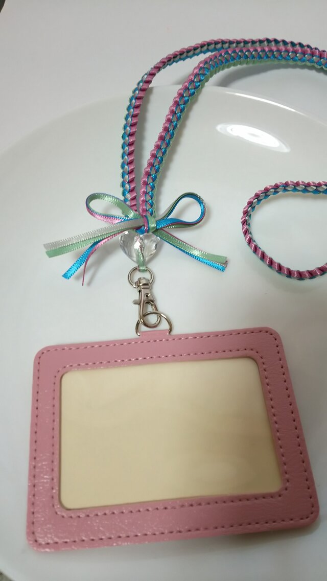 リボンストラップ☆ネームホルダー☆クリアハート☆ピンク