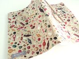 柄のお色は、時の色がすこし落ち着いた感じのベージュ、お菓子たちは、レッド、マゼンタ、ピンク、パープル、ホワイトなど様々な色です。