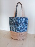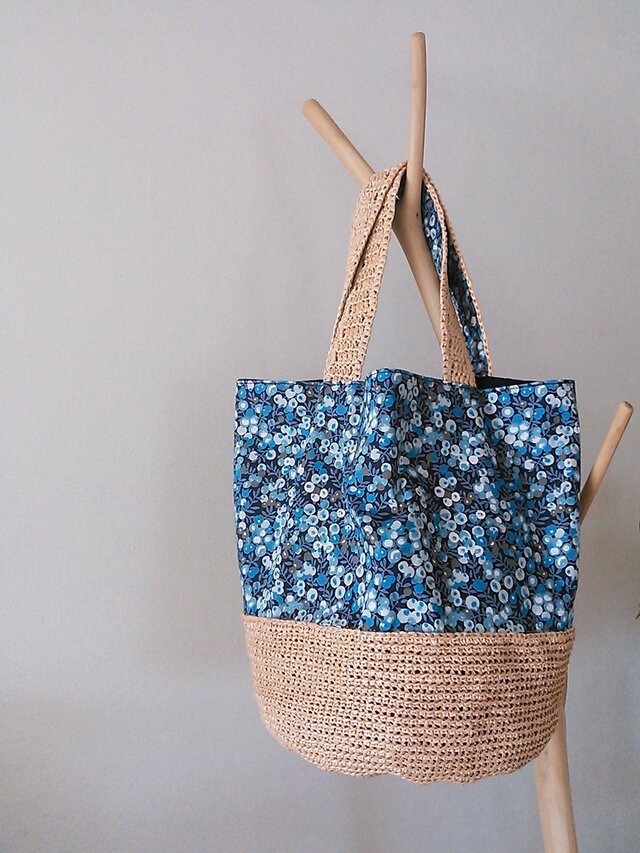 リバティのウィルトシャー(ブルー系)とエコアンダリヤ(ベージュ)編みのトートバッグです。ハンドルが長めなので、肩かけも出来ます。長財布、スマホ、ポーチ、ペットボトル、折り畳み傘と、お出かけに必要なものがひと通り入ります。