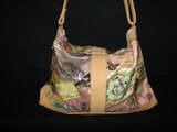 落ち着いた色合い、海外チケットをデザインしたラミネートのショルダーバックです。