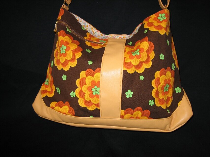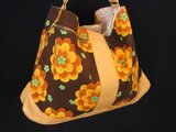 茶色に大柄のイエローフラワー、帆布のショルダーバックです。