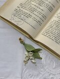 市販のアーティフィシャルフラワーではなく、一枚一枚手作業で裁断し、色を重ねアンティークな雰囲気の若草色とアイボリーに染めたすずらんです。