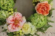 大きめの丸いコロンとしたグリーンのラナンキュラスが魅力のリースです。間に入っているオレンジ色やオフホワイトのお花とも色あいの相性が良く、全体的にとても爽やかな明るい雰囲気です。春らしい存在感あふれるリースですので玄関に飾れば毎日元気がもらえそうです。全てアーティフィシャルなので室内外ともに飾ることができます。