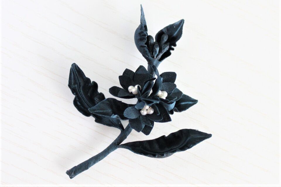 可憐な花サザンスターのコサージュです。深い濃紺色のつやが美しいイタリア製の上質なシルクコットンのサテン生地を使用しています。花の中心には小さいパールをあしらいました。式典などフォーマルな場面や、ちょっとあらたまったお出かけにも使いやすいサイズのコサージュです。