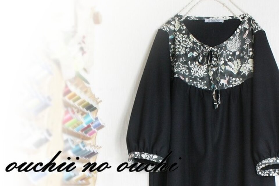 ウール100ブラックソフト中地~微薄地と大人気柄リバティタナローンの大人気柄ヨシエで可愛いリボンワンピースをおつくりしました。