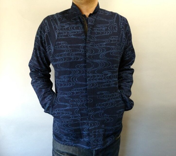 吉兆藍木綿スタンドZIPジャケット(流水模様)