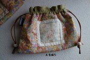 袋部分に使った生地は、おしゃれなリバティのタナローン。(口布は黄緑色のリネン生地)