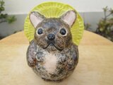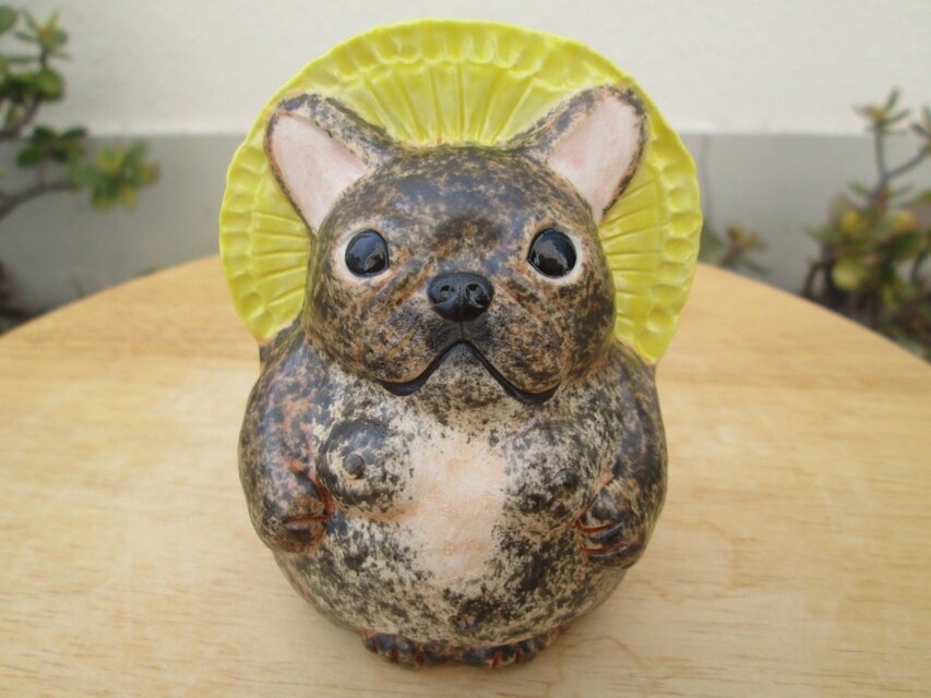 信楽の有名な狸の置物からインスピレーションを受けて製作した笠をかぶったフレンチブルドッグの置物です(*^_^*)