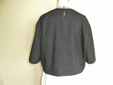 ゆったり目のシルエットですが、前身頃のウエストに2本ダーツが入り、裾で少ししぼってすっきりと見えるようにしました。衿ぐり、裾は見返しをつけ飾りステッチをしています。ドロップショルダーで肘下ぐらいの6分丈です。肩・脇はロックミシン、袖口はロックミシン後ステッチし、袖ぐりはバイヤスで始末しました。後ろスラッシュあきでカギホックが付いています。