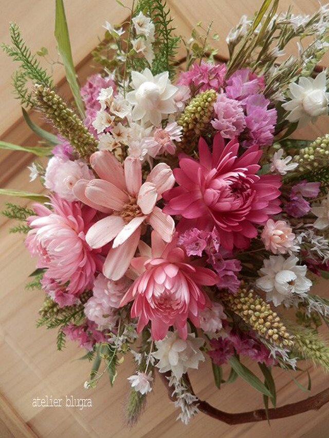 使用花材 プチフラワー、スターフラワー、アンモビウム、スターチス、アワ、ヒカゲカズラなど。
