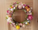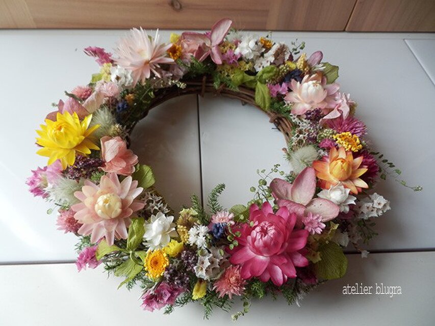 使用花材 貝細工、スターフラワー、アンモビウム、センニチコウ、アワ、ヒカゲカズラ、ダイヤーズカモミール、オレガノなど。