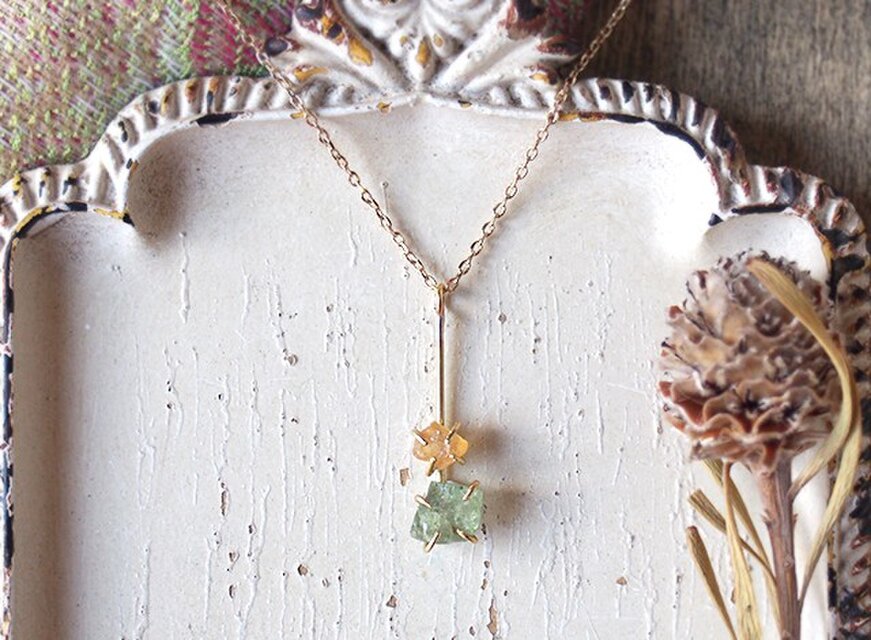 原石のイエローサファイアとグリーンアパタイトのY字ネックレス