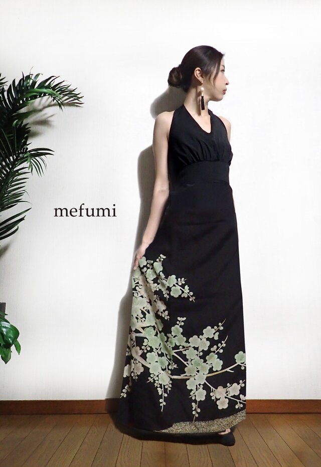受注制作 ✳︎1点物 ✳︎ アンティーク 正絹 若緑梅 着物リメイク フォーマル ロングワンピース M / Lサイズ