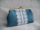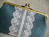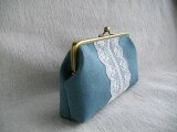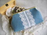 サックスリネンにバラの刺繍チュールレースをのせたがま口ポーチ