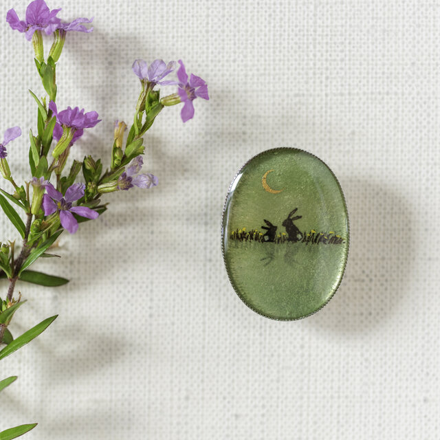 草原の親子うさぎを描いた絵(原画)を樹脂でとじこめました。