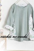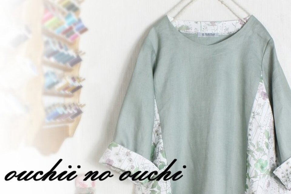しっとりリネンダークシーグリーンとリバティフランダースリネンの大人気柄<Irma>(イルマ)グリーン&ローズでサイド切り替え後ろ下がりのプルオーバーブラウスをおつくりしました。