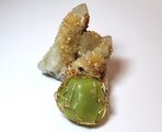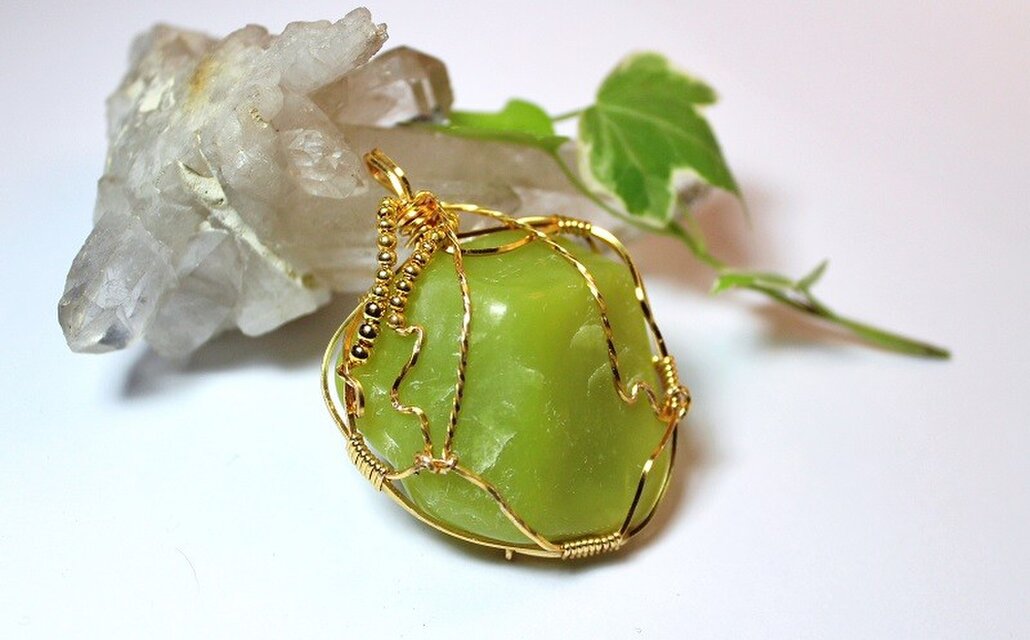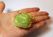 非常に大きくてボリュームのある、ヒーラライトのタンブルを、ゴールドのワイヤーで巻きました。ゴールドの小さなビーズをアレンジしました。