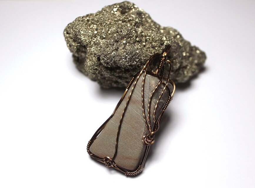 大きめで、存在感のあるノバキュライトのタンブルをアンティークゴールドのワイヤーで巻きました。