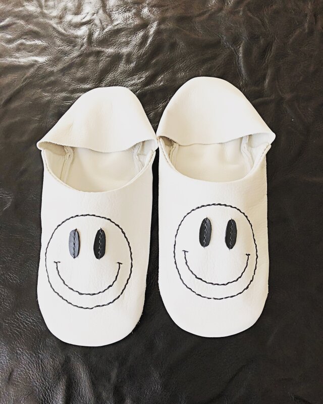 白革に黒糸でステッチしたニコちゃんのバブーシュです。