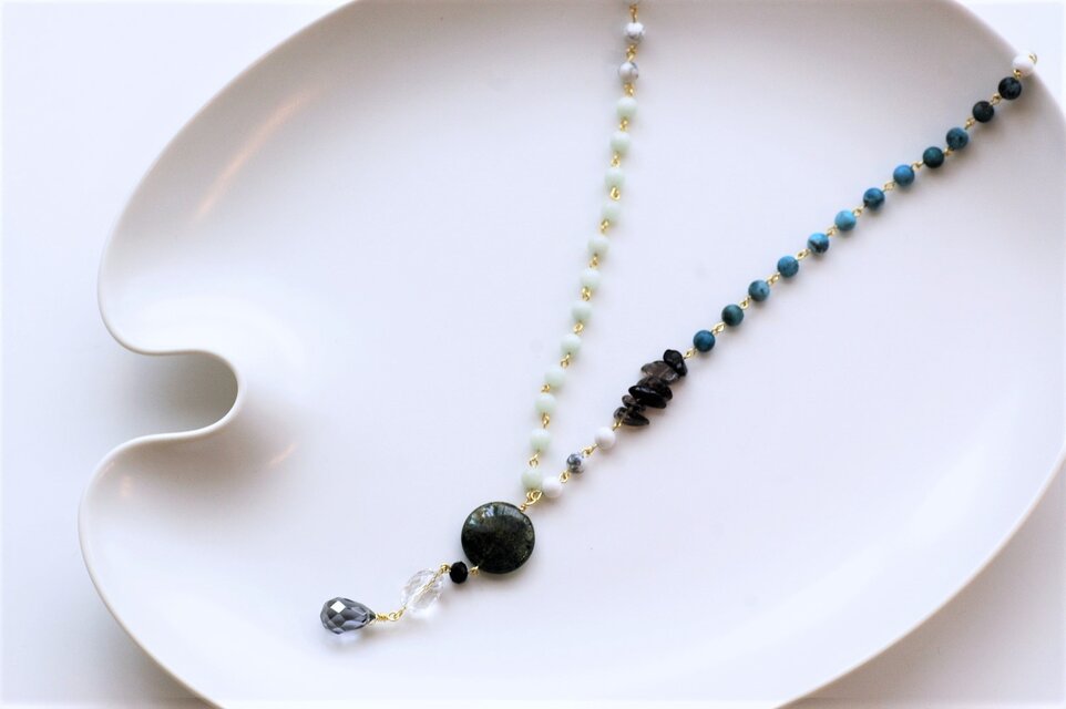 ハウライトやブルーアパタイトなどの天然石を一つ一つピンで繋げたネックレスです。