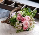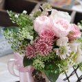 プリザーブドフラワーのピンクのバラ、また生花のようなベージュのアーティフィシャルフラワーのバラを可愛いブーケにしました。レースフラワーや白い小花、アストランティアを添えて上品の色合いの優しい雰囲気のブーケになりました。