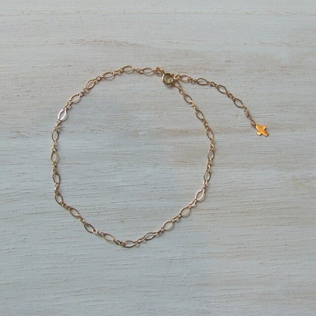 14KGFのフィガロチェーンにミニクロスをつけたシンプルなアンクレットです。