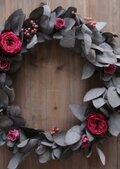 グレーのユーカリとラズベリー色の豪華なバラをシンプルに。