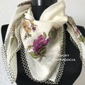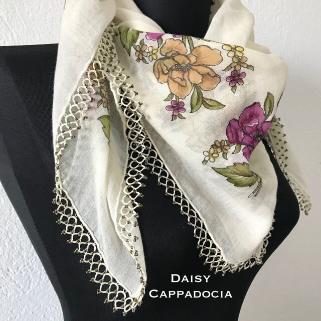 ふんわりとしたコットンスカーフに、ビーズをたくさん使ったタティングレースの技術を使いました。