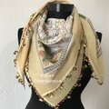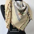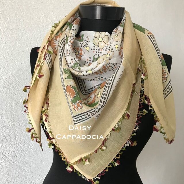 花柄のスカーフを、同系色のトゥーオヤで縁を飾ったスカーフです。
