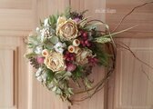 使用花材 薔薇、ペッパーベリー、アワ、晒しユーカリフルーツ、ヤマハハコ、センニチコウ、カワラヨモギ、オレガノなど。