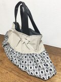 ドット模様とギャザーたっぷりの形がかわいいバッグです。
