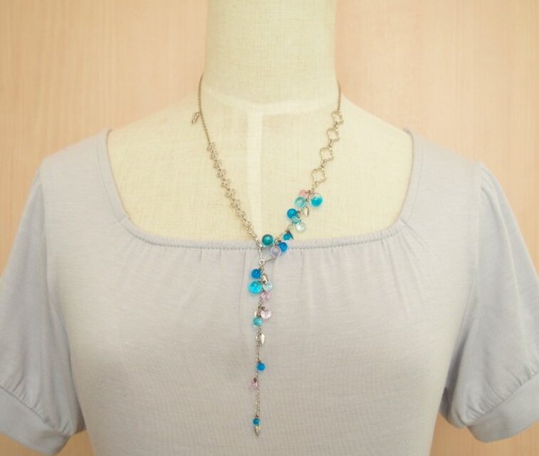花モチーフのチェーンをメインに 系とピンク系のガラス粒を非対称に配置した