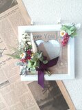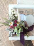 Love You の文字の入ったアンティーク調のフォトフレームに、可愛らしいお花達をアレンジしました。