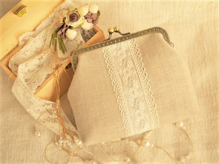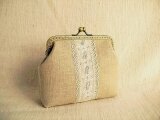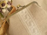 エクリュ(淡いベージュ)リネンにレースをのせたがま口ポーチ