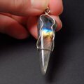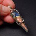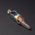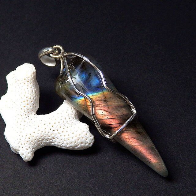 光の当たる角度によってピンク、イエロー、ブルーの輝きが浮かび上がるラブラドライトを、シルバーワイヤーでシンプルなペンダントに仕上げました。