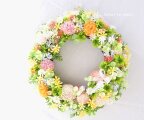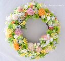 再販 黄色小花とカーネーションのリース:コットンレースリボンそえて