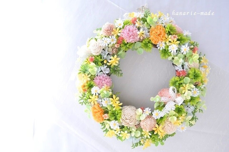 リース土台:ナチュラル素材 直径約20センチ リース素材:アーティフィシャルフラワ-(造花):黄色の小花・ミニデージー・ユーカリ、など。自然素材:ソーラーローズ・ソーラーカーネーション・ソーラーダリア・ミニコーンフラワー、など。その他:コットンレースのリボン飾り(取り外しできません)