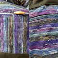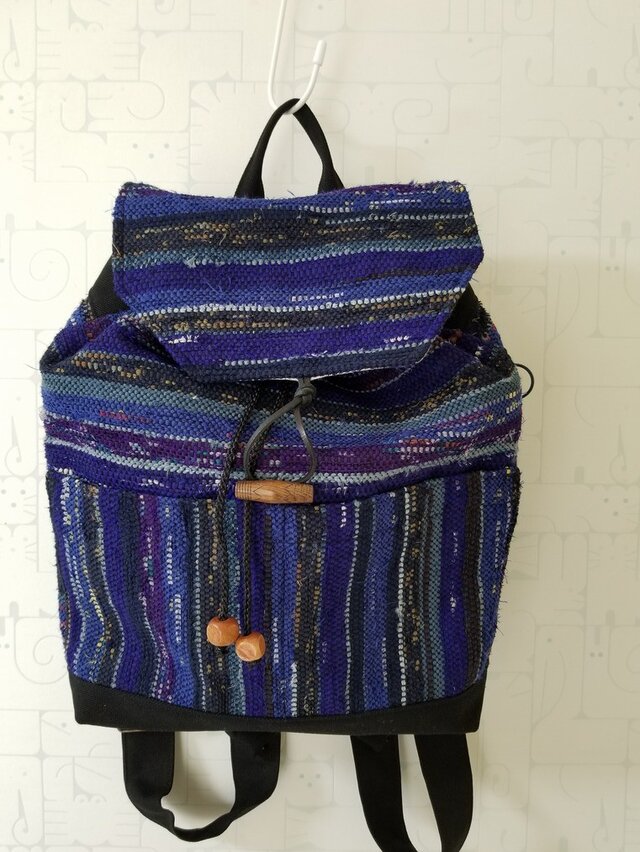綿の黒の経糸に、ブルー系の着物を裂いた布を織り込みました。