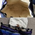背中側には、横幅いっぱいのファスナー付きポケット、表側にはパッチポケットが二つ、中布には、スマホ用ポケット、小ポケット、大ポケットと三つのポケットが付いています。