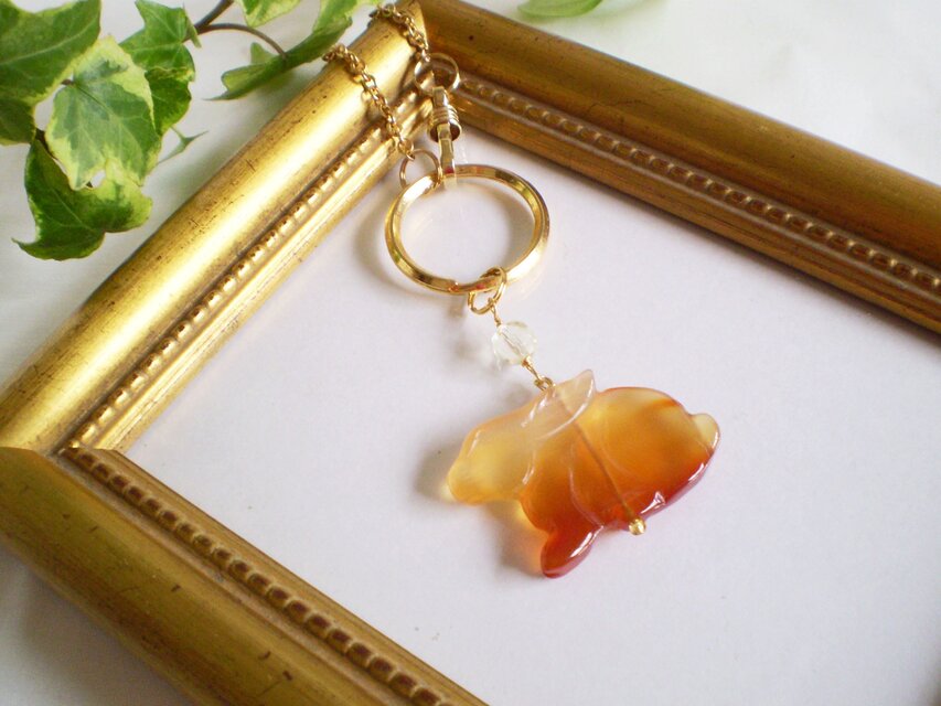 メノウのウサギチャームがかわいいバッグチャームとしても使えるキーリングです。