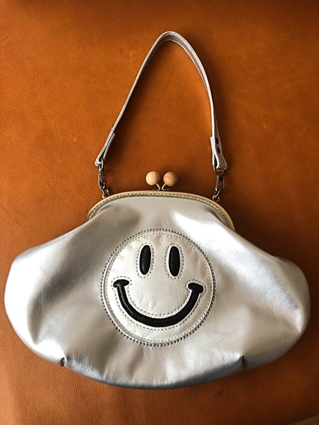 マットなシルバーカウレザーに ぷっくりニコちゃんのがま口です!