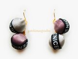 アルファベット入りの黒い布が巻かれた紫とグレーのボールが揺れるフックピアスです。