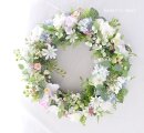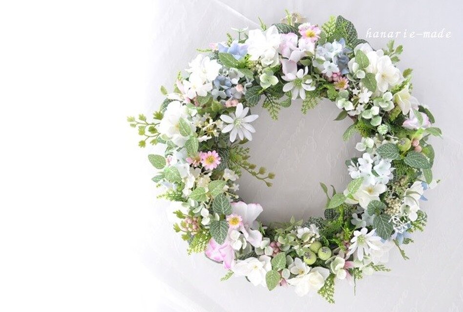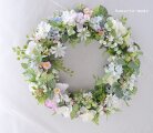 リース土台:ナチュラル素材 直径約20センチ リース素材:アーティフィシャルフラワ-(造花):デージー・紫陽花・ゼラニウム・レースフラワー・スノーボール・グリーンの実・ピンクの実・アジアンタム・ユーカリ、など。