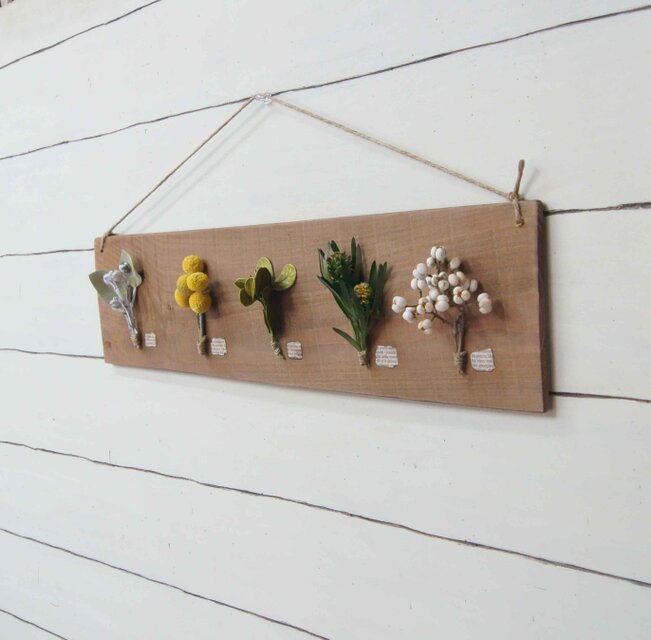 エイジング加工した古びた味のある板にドライフラワーやプリザーブドを標本風に貼り付けました。
