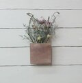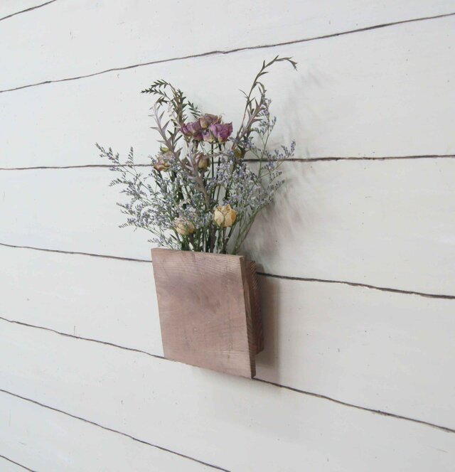 壁面に取り付けられる自家製古木風で立体感のある器にドライフラワーをアレンジしています。
