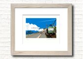 版画作品 湘南イラスト「湘南シーサイドストリートⅡ」 (七里ヶ浜の海岸線を走る江ノ電と江ノ島の2ショットのイラスト)